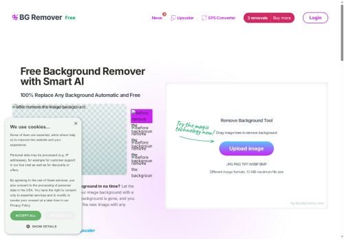 The BG Remover is an AI-powered online tool that automatically removes image backgrounds, making workflows faster, easier, and more creative. Its main features include seamless background removal, precise object detection, and high-quality results. This tool is designed to enhance productivity in graphic design, web development, marketing, and creative projects by effortlessly removing image backgrounds with AI technology.