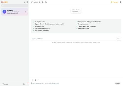 Enhance your ChatGPT experience with ChatKit, a powerful UI tool that offers an improved interface and useful features. ChatKit includes main features such as password generation, language translation, JavaScript console usage, and SQL terminal operations. With ChatKit, users can enjoy an enhanced user experience and easily access a variety of functions to make their interactions more efficient and seamless.