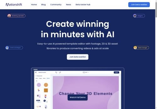 Motionshift is an AI-powered tool that enables users to create high-quality 2D and 3D content with ease. Its main features include the ability to create captivating videos, engaging social media ads, stunning product showcases, eye-catching event promos, and professional business presentations effortlessly. With Motionshift, users can unleash their creativity and produce stunning visual content without the need for extensive technical skills. This innovative tool is perfect for those looking to elevate their video and advertising projects to the next level.