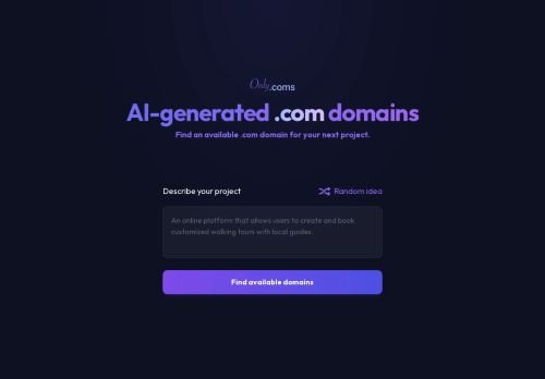 Discover AI-generated .com domains for your projects with Onlycoms.com. This intuitive online tool is ideal for entrepreneurs, web developers, and marketing professionals seeking memorable .com domains for new ventures, client projects, and campaigns. Onlycoms.com offers a wide range of main features such as advanced algorithms, domain availability checks, and keyword suggestions to help you find the perfect domain name quickly and efficiently. Start using Onlycoms.com today to streamline your domain search process and find the perfect .com domain for your next project.