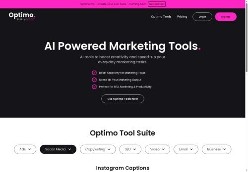 Optimo is an AI-powered marketing solution that saves time and delivers instant results for smart marketers. Its main features include automating content creation for social media, generating efficient keyword clusters and blog post titles, and streamlining work for copywriters and content creators. With Optimo, marketers can easily create engaging and effective marketing content without spending hours on manual tasks. This innovative tool is designed to enhance productivity and drive success in the ever-evolving digital marketing landscape.
