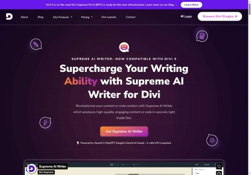 The Supreme AI Writer is a powerful Divi plugin powered by OpenAI’s ChatGPT that revolutionizes content creation by generating high-quality, engaging content in seconds. With its advanced AI technology, this tool is perfect for copywriters and developers looking to streamline website development and generate high-quality code efficiently. Its main features include the ability to produce comprehensible and readable texts, making it an essential tool for those with an exceptional flair for language. Revolutionize your content creation process with the Supreme AI Writer and experience the power of AI in generating top-notch content effortlessly.