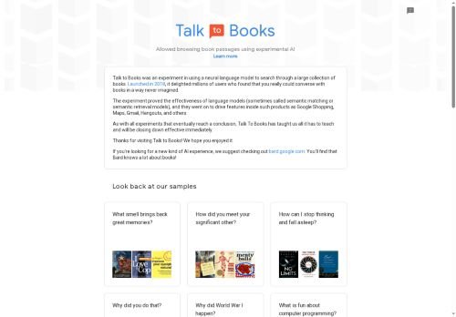 Talk to Books is an AI tool that helps users discover new books, explore ideas, find insightful passages, generate questions, and gain knowledge through experimental AI.