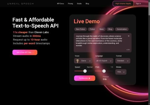 Unreal Speech is a cost-effective text-to-speech API for Scale, offering up to 95% savings compared to popular alternatives, with use cases including voiceover for videos, audiobooks, accessibility tools, virtual assistants, and language learning apps.